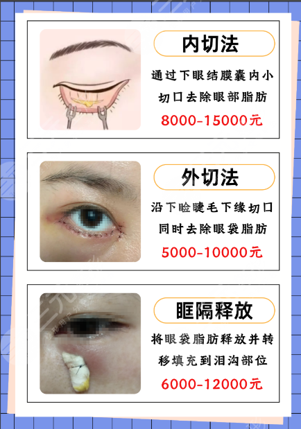 備注:價格包含術(shù)前檢查、麻醉費、手術(shù)費、術(shù)后護理包,無隱性消費。眶隔脂肪釋放若需聯(lián)合皮膚提拉,價格上浮15%-20%;內(nèi)吸眼袋若脂肪過多需分次吸出,可能額外收取少量操作費。
