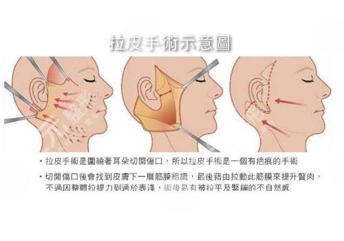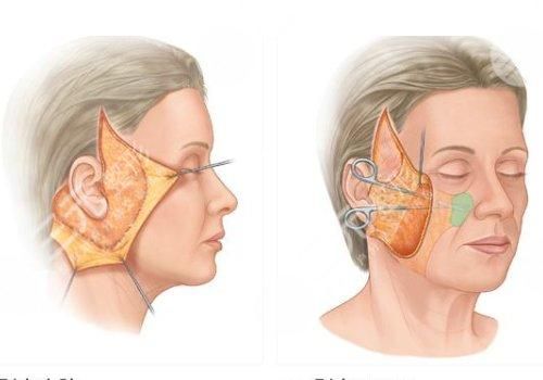 大拉皮手術:通過開刀方式將松弛的肌膚和臉部深部筋膜層向后提緊,并將多余的肌膚切除,這樣就能夠GET緊致肌膚、去除皺紋的目的,手術切口比較隱蔽,一般選擇在耳旁或者是發(fā)際線內。