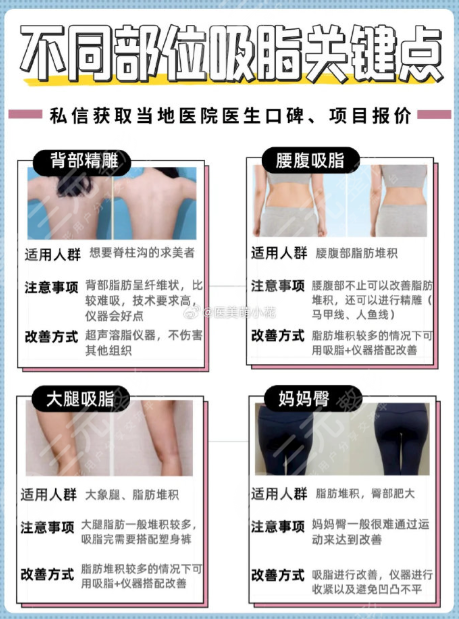 很多人覺得“吸脂安全只看醫(yī)生”,其實(shí)設(shè)備和部位適配也關(guān)鍵!比如面部吸脂用微針,腰腹用水動力,設(shè)備不對再牛的醫(yī)生也難保證安全。我結(jié)合山東省立醫(yī)院2024年臨床數(shù)據(jù),整理了最常見的3類吸脂項(xiàng)目細(xì)節(jié),連安全要點(diǎn)和恢復(fù)數(shù)據(jù)都標(biāo)好了: