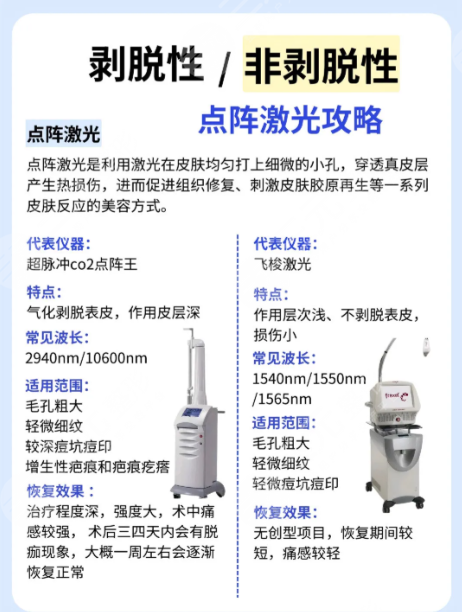 很多人不知道,點陣激光分“剝脫”“非剝脫”“微剝脫”,就像買手機分基礎(chǔ)版、Pro版,適配問題、價格、恢復(fù)時間天差地別。大同第三人民醫(yī)院有4臺進口設(shè)備,我整理了最常用的3類,選前必看: