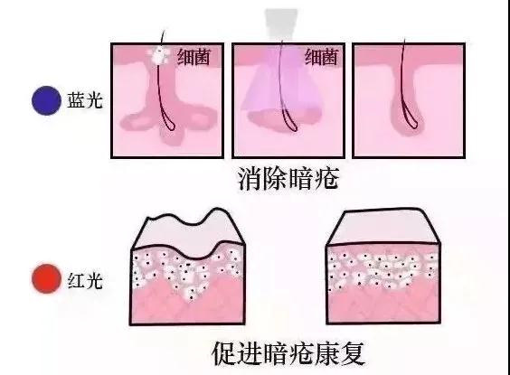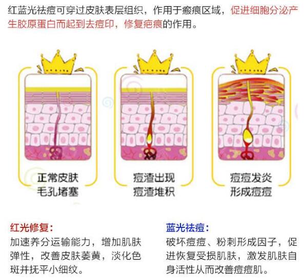 藍(lán)光是光波長(zhǎng)在405--420nn上下的深藍(lán)色光,藍(lán)光功于肌膚淺表層,快速消滅痤瘡桿菌,進(jìn)而具有抑菌消腫的功,還可率高抑止皮腺植物油脂的代謝,避免短時(shí)間臉上痘痘的發(fā)作。