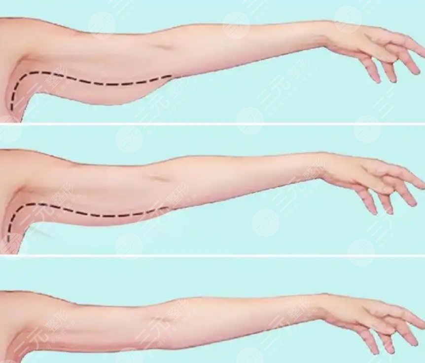 醫(yī)生拿記號(hào)筆在手臂后側(cè)畫線,畫的就是“膨出區(qū)”——上臂后外側(cè)1/3處。這里脂肪墊厚,且纖維間隔松散,吸管進(jìn)去不費(fèi)勁。再往里是肱三頭肌,外覆深筋膜,醫(yī)生會(huì)貼著深筋膜表面操作,不傷肌肉。簡單說,吸的是“淺層脂肪+部分中層脂肪”,保留至少1厘米脂肪墊,防止術(shù)后凹凸。