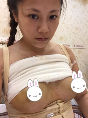 這個是第十天的時候,不能穿內(nèi)衣,穿的是醫(yī)院的抹胸,現(xiàn)在自己摸了摸胸,軟軟的,很逼真,很自然的,這時候就特別感謝給我做手術(shù)醫(yī)生。還是不能洗澡,額,有一點受不了啊。