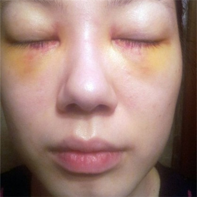 術(shù)后第二天的照片,眼睛下面還是腫的呢,還有淤青,醫(yī)生頂住要冰敷,每天二十分鐘左右,痊愈大概需要三個(gè)月左右~~~