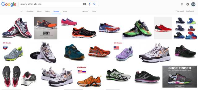 輸入“running shoes”,就會(huì)出現(xiàn)各種跑鞋,眼花繚亂。往下看在圖片結(jié)果的上端出現(xiàn)了一條不同顏色的單詞條,這是Google推薦的篩選細(xì)分類目。