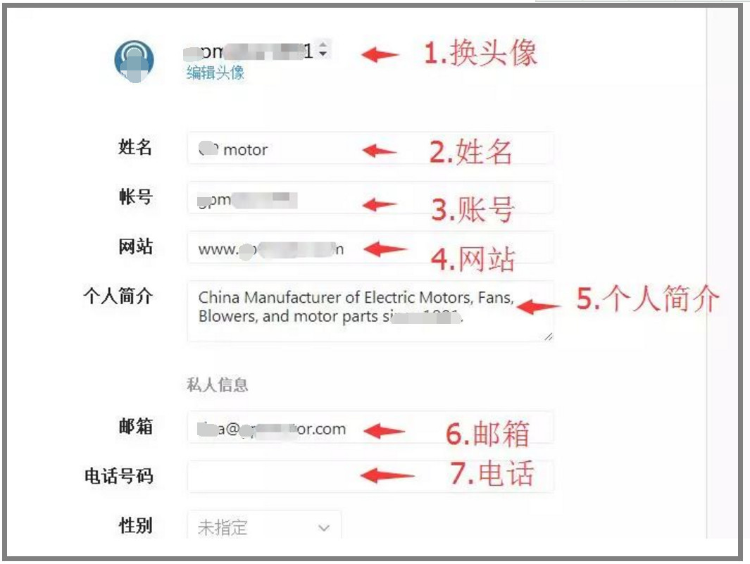 再點(diǎn)擊,全名旁邊的 "編輯個(gè)人主頁”,開始編輯你的個(gè)人信息。1)頭像。2)姓名。3)賬號。4)網(wǎng)址。5)簡介。6)郵箱。7)電話。
