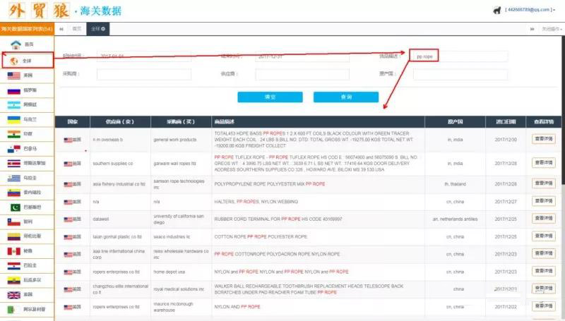 打開了海關(guān)數(shù)據(jù),這里共有52個國家+兩個地區(qū),共54個,選擇對應(yīng)國家或地區(qū)(PS:現(xiàn)在外貿(mào)狼升級了,可以直接一鍵查詢?nèi)虻目蛻簦┲?,可以用貨品描述搜索,也可以用采購商、供?yīng)商來直接搜索,建議用大詞,寬泛一些詞來搜,如下,我使用關(guān)鍵詞“pp rope”搜索客戶,如下: