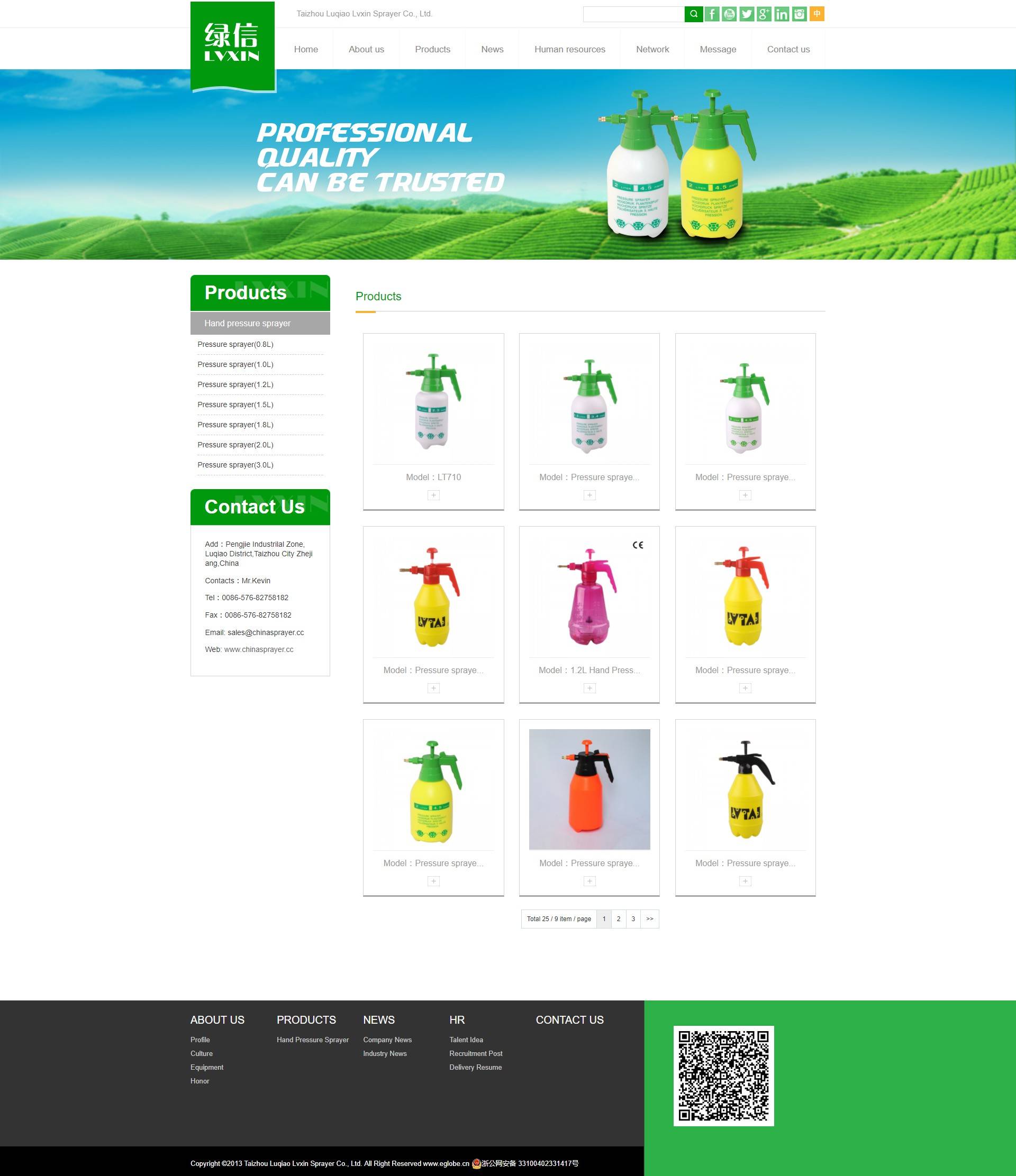 臺(tái)州市路橋綠泰噴霧器廠(普通合伙)是噴霧器、氣壓式噴霧器、手動(dòng)噴霧器、電動(dòng)噴霧器、追肥器的專業(yè)生產(chǎn)廠家。目前擁有各種注塑機(jī)、吹塑機(jī)二十余臺(tái)。生產(chǎn)的氣壓噴霧器規(guī)格有0.8升噴霧器、1.0升噴霧器、1.5升噴霧器、2.0升噴霧器、3.0升噴霧器。經(jīng)過(guò)近十幾年的發(fā)展,銷售網(wǎng)絡(luò)遍布全國(guó)30個(gè)省。 綠泰噴霧器廠生產(chǎn)的噴霧器,廣泛適用于衛(wèi)生防疫,噴霧殺蟲(chóng),消毒殺菌,家禽滅蚊,澆花,以及用于蔬菜、花卉、果樹(shù)等病、蟲(chóng)、草害的防治。